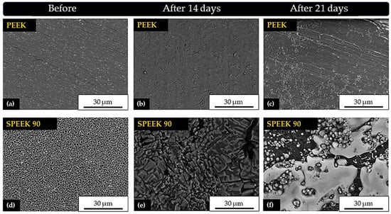 SEM micrographs of PEEK and SPEEK 90 surfaces, (a,d) and after immersion in SBF for 14 (b,e) and 21 days (c,f), with 3000× magnification.