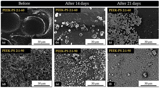 SEM micrographs of PEEK-PS 2:1-60 and PEEK-PS 2:1-90 surfaces, before (a,d) and after immersion in SBF for 14 (b,e) and 21 days (c,f), with 3000× magnification.