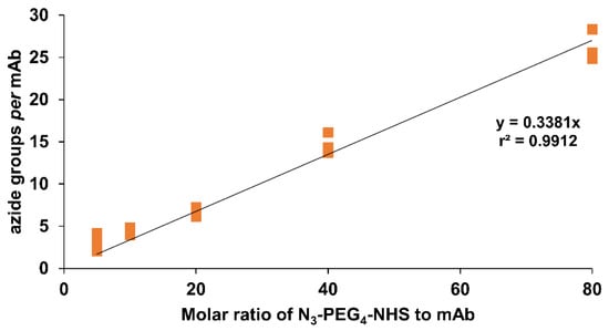 Average number of azide groups per trastuzumab calculated by MALDI-TOF MS analysis as a function of the initial molar ratio of N3-PEG4-NHS:mAb (n = 3–4 independent experiments). Each reaction was performed at room temperature in phosphate buffer (pH 9.2) for 15 min before SEC-HPLC purification. Pearson correlation coefficient r2 and equation of linear regression are shown.