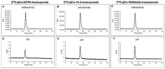 Analytical radio-HPLC chromatograms of [64Cu]Cu-DOTA-trastuzumab (obtained post-purification) (A), [64Cu]Cu-15-5-trastuzumab (B) and [64Cu]Cu-NODAGA-trastuzumab (C), compared to their analytical UV-HPLC chromatograms (D–F), respectively. The radio-HPLC detector was connected in series after the UV detector accounting for the slight difference in retention times (~0.5 min) observed between UV and radioactive signals.
