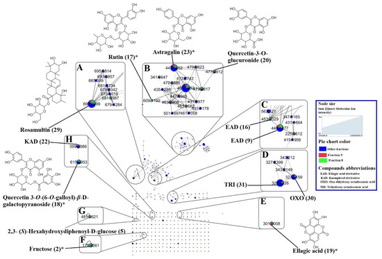 Molecular network of fractions 1 to 9 of Terminalia leiocarpa leaves MeOH extract showing the major compounds in fractions 8 (green), 9 (red), and other fractions (blue). The numbers indicate the identification code of the compounds and asterisks show the compounds whose identification was confirmed by injection with the standard. (A) triterpenic derivatives, (B) O-glycosylated flavonoids, (C) ellagic acid derivatives, (D) fatty acids, (E) ellagic acid, (F) sugar, (G) tannin, (H) glycosylated galloylated flavonoids. Edge widths are proportional to the level of similarity (cosine score). The size of the nodes is proportional to the sum of quasi-molecular ion intensity of fractions 1 to 9. * compounds identified by standard comparison.