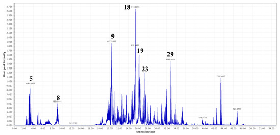 Base peak intensity (BPI) chromatogram of fraction 8 of the MeOH extract of Terminalia leiocarpa showing the main compounds identified. (5) 2,3-(S)-hexahydroxydiphenoyl-D-glucose or isomer; (8) gallic acid; (9) ellagic acid derivative; (18) quercetin-3-O-(6-O-galloyl)-β-D-galactopyranoside or isomer; (19) ellagic acid; (23) astragalin, and (29) rosamultin or isomer.