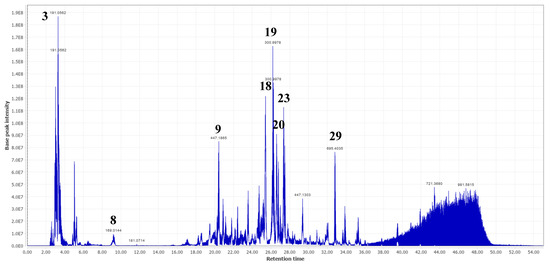 Base peak intensity (BPI) chromatogram of fraction 9 of the MeOH extract of Terminalia leiocarpa showing the main compounds identified. (3) Quinic acid; (8) gallic acid; (9) ellagic acid derivative; (18) quercetin-3-O-(6-O-galloyl)-β-D-galactopyranoside or isomer; (19) ellagic acid; (20) quercetin-3-O-glucuronide; (23) astragalin, and (29) rosamultin or isomer.
