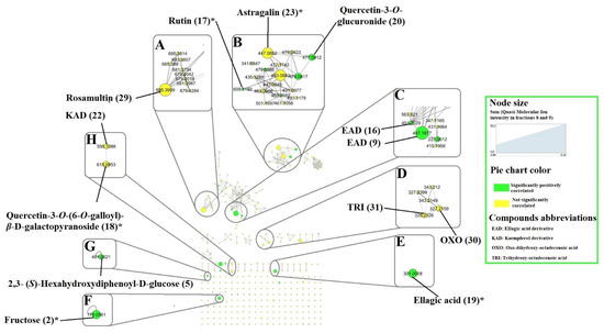 Molecular network of fractions of MeOH extract of Terminalia leiocarpa leaves showing compounds significantly positively (green nodes) or not significantly (yellow nodes) correlated with the anthelmintic activity on C. elegans. The numbers indicate the identification code of the compounds and asterisks show the compounds whose identification was confirmed by the injection of a standard. (A) triterpenic derivatives, (B) O-glycosylated flavonoids, (C) ellagic acid derivatives, (D) fatty acids, (E) ellagic acid, (F) sugar, (G) tannin, (H) glycosylated galloylated flavonoids. Edge widths are proportional to the level of similarity (cosine score). The size of the nodes is proportional to the sum of quasi-molecular ion intensity of fractions 8 and 9. * compounds identified by standard comparison.