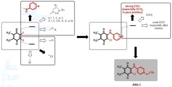 Possible modifications of dimethyl-1,4-benzoquinone moiety within our previous studies and the selection of a target analog (Both black filled arrow and red colored moiety are used to indicate the selected structure in this study. On the other hand, a white filled arrow and dark grey colored moiety are used to show other possible moieties not included in this study).