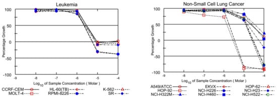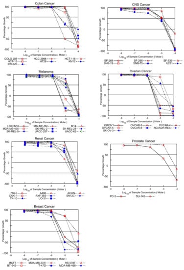 The PQs were investigated for their growth inhibitory activity by the NCI (Bethesda, MD, USA) protocol at a 10 µM concentration in DMSO for 60 cancer cell lines. Compounds were added to the microtiter culture plates and incubated for 48 h at 37 °C. Sulforhodamine B (SRB) was applied for end-point detection. The percentage of the growth of the exposed cells was measured in comparison to the nonexposed control cells, and the findings of each tested compound were calculated [,,].