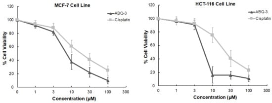 ABQ-3 displayed significant sensitivity towards HCT-116 and MCF-7 cell lines based on NCI GI50, TGI, and LC50 parameters. In addition, CRC and breast cancer are important research platforms that we have been working on for a long time. Therefore, we further examined the anticancer effects of ABQ-3 on these two cell lines via an MTT (3-(4,5-dimethyl-2-thiazolyl)-2,5-diphenyltetrazolium bromide) assay at five dose concentrations (1, 3, 10, 30, and 100 μM) in comparison with cisplatin. Cisplatin was selected as a control because cisplatin has been used for the treatment of various cancers such as CRC and breast cancer [,,,,].