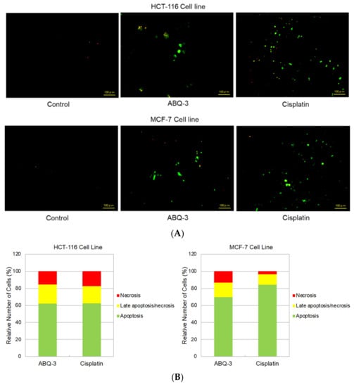 Since ABQ-3 displayed notable anticancer effects on CRC and breast cancer cells, we further searched for its apoptotic effects in HCT-116 and MCF-7 cells using the annexin V/ethidium homodimer III staining assay, which was detected by a fluorescence microscope representing apoptosis, necrosis, or late apoptosis/necrosis with green, yellow and red staining, respectively (Figure 6A). ABQ-3 was found to possess similar apoptotic behavior in HCT-116 cells (61.80%) with cisplatin (62.30%). In addition, ABQ-3 showed 22.70% late apoptotic/necrotic and 15.50% necrotic activity in HCT-116 cells when compared with cisplatin (20.20% and 17.50%, respectively) (Figure 6B). The difference in apoptosis enhancement between ABQ-3 and cisplatin treatment in HCT-116 cells was found to not be significant; conversely, it was found to be significant in MCF-7 cells, as shown in Figure 6C. MCF-7 cells underwent apoptosis with a higher percentage compared to HCT-116 cells (69.70%) after ABQ-3 exposure. ABQ-3 led to 16.67% late apoptosis/necrosis and 13.60% necrosis in MCF-7 cells (Figure 6B).