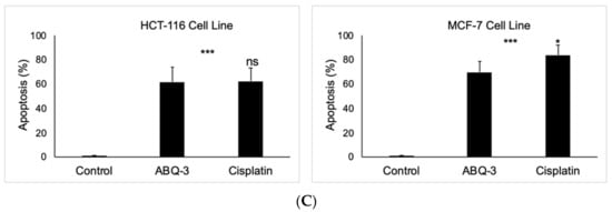 Abnormalities in apoptosis can also deteriorate the pathogenesis of CRC and breast cancer and decrease the treatment success causing resistance to current therapy options [,,,,,,,]. ABQ-3 induced apoptosis in both cell lines compared to cisplatin. Comparing our previous results, it was also concluded that ABQ-3 displayed a similar apoptotic pattern with compound 3 (Figure 10) in HCT-116 cells [].