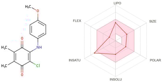 Radar diagrammatic representation of physicochemical properties of ABQ-3 from SwissADME (Swiss Institute of Bioinformatics, Lausanne, Switzerland).