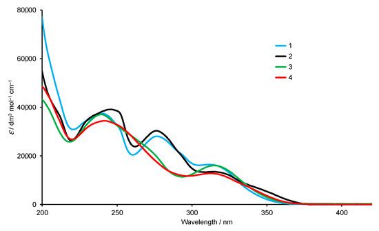 Absorption spectra of compounds 1–4 in MeCN (2.0 × 10−5 mol dm−3).