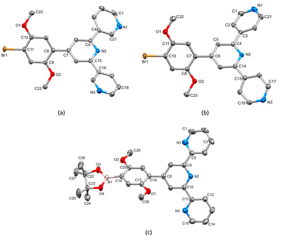 In order to achieve an efficient synthesis of tritopic ligands containing combinations of 2,2′:6′,2″- and 3,2′:6′,3″-tpy or 2,2′:6′,2″- and 4,2′:6′,4″-tpy metal binding domains, we first prepared compound 1 (Scheme 3) using the one-pot method of Wang and Hanan [19]. Bromo-2,5-dimethoxybenzaldehyde was reacted with two equivalents of 2-acetylpyridine in basic EtOH solution followed by the addition of an excess of aqueous NH3. Compound 1 was isolated in 43.3% yield. The reaction of 1 with bis(pinacolato)diboron in the presence of [Pd(dppf)Cl2] catalyst and KOAc led to 2 (Scheme 3), which was isolated in 50.2% yield. This strategy is analogous to that used by Sun et al. for the preparation of 4′-[4-(4,4,5,5-tetramethyl-1,3,2-dioxaborolan-2-yl)phenyl]-2,2′:6′,2″-terpyridine [20]. Compounds 3 and 4 (Scheme 3) are isomers of 1 and were prepared in an analogous manner using 3- or 4-acetylpyridine in place of 2-acetylpyridine. After recrystallization, 3 and 4 were obtained in 29.2% and 38.0% yields, respectively. The methoxy groups in these compounds were introduced to improve the solubilities of the final ligands 5 and 6 described in Section 2.2.