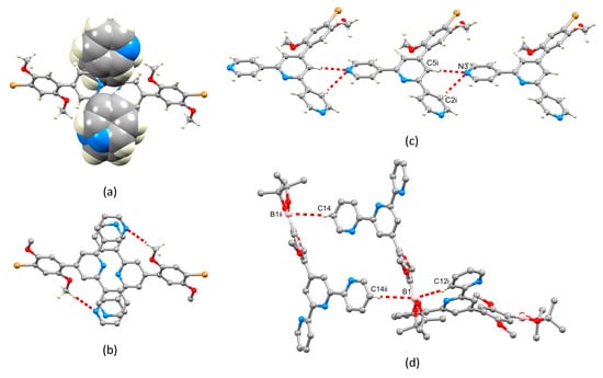 (a,b) Packing of molecules of 3: (a) face-to-face π-stacking of pyridine rings, and (b) C–H…N hydrogen bonds within the same structural motif as that shown in part (a). (c) Bifurcated hydrogen bonding interactions in 4; symmetry code i = x, y, –1 + z. (d) C–H…B1 contacts in the packing of molecules of 2; symmetry codes: i = 3/2–x, 1–y, 1/2+z; ii = 2–x, 1–y, 1–z.