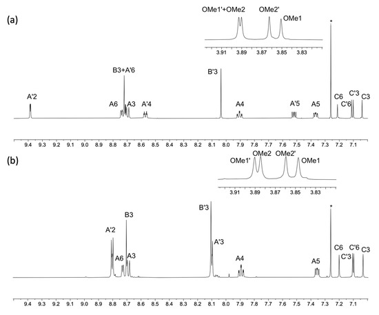 A comparison of the aromatic regions of the 1H NMR spectra of compounds (a) 5 and (b) 6 with the OMe region shown in the insets (500 MHz, CDCl3, 298 K). * = residual CHCl3. For atom labelling, see Scheme 6. HMQC and HMBC spectra are shown in Figures S17–S20 in the Supporting Materials.