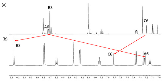 Comparison of the aromatic regions of the 1H NMR spectra (500 MHz, 298 K) for (a) compound 6 in CDCl3, and (b) [Fe(6)2][BF4]2 in CD3CN. Differences in solubilities required the use of different solvents.