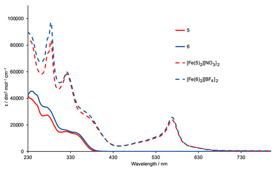 Absorption spectra of ligands 5 (MeCN/CHCl3, see text) and 6 (MeCN, 2.0 × 10−5 mol dm−3), and of the complexes [Fe(5)2][NO3]2 and [Fe(6)2][BF4]2 (MeCN, 1.0 × 10−5 mol dm−3).