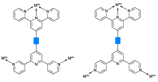 Schematic illustration of the coordination of tritopic ligands with 2,2′:6′,2″- and 3,2′:6′,3″-tpy or 2,2′:6′,2″- and 4,2′:6′,4″-tpy metal-binding units. The blue rectangle represents any organic spacer.