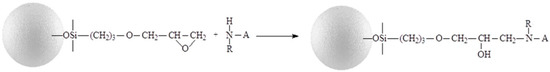 10 g of gel was suspended in 50 mL of 0.1 M sodium acetate buffer with pH 5.5 adjusted by adding glacial acetic acid. Then 7.8 mL of 3-glycidoxypropyltriethoxysilane was added to the suspension. The reaction mixture was vigorously stirred for 2 h and left without heating under moderate stirring for 4 days. Upon completion of the reaction, the precipitate was decanted and washed with water, ethanol, and acetone, then filtered and air-dried. The prepared epoxy-activated silica contained 7.1% carbon according to elemental analysis performed with a Vario III EL instrument (Elementar, Germany).