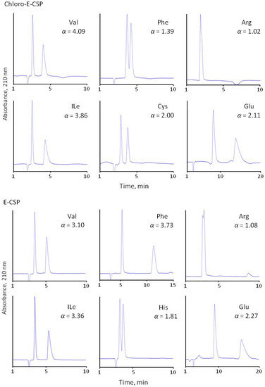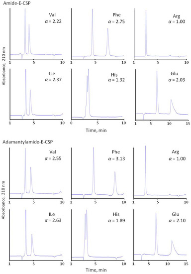 Surprisingly, the adsorbent with immobilized chloreremomycin (Chloro-E-CSP) with a structure similar to vancomycin demonstrates better enantioselectivity compared with E-CSP for all of the amino acids, except aromatic amino acids (Trp, Tyr, Phe, His) and heterocyclic Pro (Figure 4 and Table 3). Enantioselectivity drops from 1.83, 4.30, and 3.79 to 1.10, 1.24, and 1.31 were noted for Trp, Tyr, and Phe with an 0.1 M phosphate buffer (pH 4.5) containing 10 v/v% methanol as eluent, respectively. Such a significant decrease in α value can be explained by the deterioration of π-π interactions between aromatic rings of amino acids and the aromatic ring in the first “basket” of the chiral selector. The presence of chlorine atoms in the aromatic ring of eremomycin can reduce this interaction due to the mesomeric effect. At the same time, the influence of the steric hindrance effect of rigid bulky aromatic and heterocyclic fragments in amino acids on chiral recognition cannot be ignored. A decrease in enantioselectivity from 9.0 to 2.7 for Pro and from 1.4 to 1.0 for His can be associated with steric hindrance. Importantly, enantioselectivity values for these amino acids on amide-type CSPs (Amide-E-CSP and Adamantylamide-E-CSP) are very close to those obtained with E-CSP.