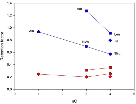 The interesting effect of alkyl group structure in aliphatic amino acids (Ala, Val, Leu, Ile, Nle, NVa) on separation enantioselectivity was found. The effects of hydrophobic interactions and the size of the alkyl group expressed as a number of carbon atoms on the retention and separation enantioselectivity of Chloro-E-CSP were investigated for structurally similar amino acids with different alkyl- groups in the molecules, including methyl- (Ala), isopropyl (Val), n-propyl- (NVa), n-butyl (NLe), isobutyl (Leu), and sec-butyl- (Ile). The corresponding dependences obtained for n-alkyl- and iso-alkyl-containing amino acids are presented in Figure 6. Clearly, the increase in the alkyl group size decreases both retention and enantioselectivity.