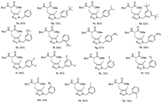 Synthesis of Boc-His (1-Bzl-5-iodo)-OMe: The N-terminal of His-OMe (3) was protected with a Boc group in the presence of di-tert-butyl dicarbonate (Boc2O) to obtain Boc-His-OMe (4, Scheme 1) which was further subjected to iodination by direct electrophilic halogenation in the presence of N-iodosuccinimide at ambient temperatures under dark and inert conditions [28]. Under these conditions, both C-2,5-diiodo (5) and C-5-iodo (6) products were obtained. The crude products were purified using a silica gel column with hexane:ethyl acetate as a solvent system. Boc-His-5-iodo-OMe (6) was then benzylated at the N-1 position using various substituted benzyl bromides and the final derivatives (7a–o) were isolated in 72–92% yield (Figure 2).