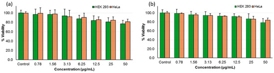 Mammalian cell cytotoxicity of peptide (a) 10d and (b) 10o as percentage viability of HEK-293 and HeLa cells at different concentrations.