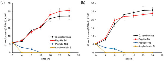Time–kill kinetics profile for (a) peptide 10d, with amphotericin B as positive control, while C. neoformans cells and peptide 9d were negative controls; (b) peptide 10o, with amphotericin B as positive control while C. neoformans cells and peptide 9o were negative controls.