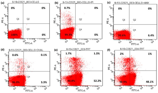 Apoptosis includes a series of events occurring inside the cell, causing changes in plasma membrane, genetic material and various internal proteins, therefore leading to programmed cell death. One of the early markers of apoptosis is the translocation of a membrane phospholipid, phosphatidylserine, from the inner to the outer leaflet of the plasma membrane without altering the integrity of the plasma membrane [30]. Annexin V-FITC interacts with the externalized phosphatidylserine, therefore showing the cell change towards apoptosis which can be analyzed using flow cytometry [31,32]. The four quadrants in flow cytometry indicate different stages of the cells. The percentage depicts the population of the cells in a specific stage. Q1 corresponds to the percentage of cells undergoing necrosis, Q2 depicts the early apoptotic stage of the cells whereas Q4 corresponds to the cells in late-stage apoptosis and Q3 depicts the cells in the native state [33].
