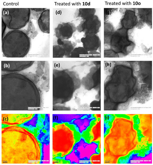 High-resolution transmission electron microscopy (HRTEM) provided an explicit view of the structural details of cells along with intricate changes that occur during the cell wall disruption. The cryptococcal cells in Figure 7a–c display a distinct inner plasma membrane covered with a layer of outer membrane followed by a faded capsule. The cell organelles can also be distinguished faintly from the images. However, the cells treated with peptide 10d (Figure 7d–f) show complete lysis of the cell membrane. The outer membrane and capsule are not clearly distinguishable. The intracellular content of cells have oozed out and the cells appear as a stack of non-distinguishable structures lying one over the other. However, the level of cell membrane disruption was much more severe in the case of the 10o-treated cells (Figure 7g–i). The cells lost their shape completely and appear to have fused intracellular material. The cells were highly shrunken and the cell membrane was completely damaged as compared to the untreated cells.