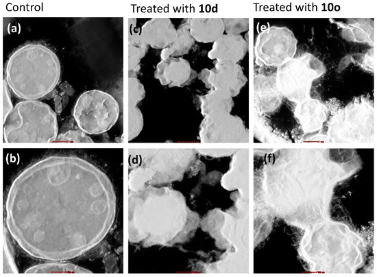 Morphological study of C. neoformans cells and cells treated with bioactive peptides by STEM. Images (a,b) represent the morphology of untreated/healthy cells; images (c,d) represent the cells treated with 10d; and images (e,f) represent the cells treated with 10o. The scale bar for images (a,c,e) is 1 μm and for images (b,d,f) it is 0.5 μm.