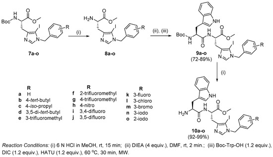 Synthesis of peptides (Series 1–2): Synthesis of the Trp-His(1-Bzl-5-iodo)-OMe class of peptides was carried out from the C- to the N-terminus by sequential deprotection and coupling reactions (Scheme 2). Acidolysis of 7a–o was accomplished with 6 M HCl to obtain 8a–o, and then neutralized with DIEA.