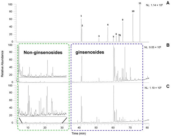 Extracted ion chromatograms of ginsenoside standard (A), and total ion chromatograms of wild (B) and cultivated (C) in negative ion mode (ESI−). The peak number labels in Figure 1A refer to the ginsenosides in Table S1. The extraction range of Figure 1A was selected as ± 0.05 Da of theoretical m/z shown in Table S1.