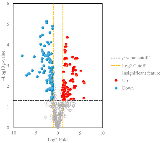 The ion features with selective fold change threshold (>2) and t-tests threshold (p < 0.05) were selected to generate the volcano plots using Microsoft Excel (Microsoft Corporation, Redmond, WA, USA). Both fold changes and p-values were log-transformed, and the further its position away from the (0, 0), the more significant the feature is. Statistical analysis was carried out using Student’s t-test function available in the Microsoft Excel software (Microsoft Corporation, Redmond, WA, USA). The p values less than 0.05 were considered statistically significant.