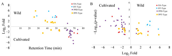 To obtain a more intuitive presentation, the distribution trends of different ginsenoside types between cultivated and wild ginseng samples were further characterized based on retention times and quantitative variations by volcano plots. As indicated in Figure 4B, the number of PPD-, PPT-, OT-, and OA-type ginsenosides, which are more abundant in wild ginseng, is 2, 10, 6, and 1, respectively. The corresponding number of ginsenosides more favorable in cultivated ginseng is 26, 7, 0, and 4, respectively. In other words, the number of PPD- and OA-types showed an advantage in cultivated ginsengs; however, the dominant OT-types were specifically exiting in wild ginsengs. Interestingly, the abundant ginsenosides in cultivated ginsengs were subsequently eluted after 50 min; conversely, the corresponding ginsenosides in wild ginsengs primarily appeared before 50 min (Figure 4A). It could be speculated that wild American ginsengs are rich in polar ginsenosides, yet those are less polar in cultivated ginseng. Additionally, if not considering the difference of glycosyl substituents, the polarities of PPT-type ginsenosides tend to be higher than those of PPD-type due to the existence of one more hydroxyl group in PPT-type aglycon than in PPD-type aglycon. This point is consistent with our conclusion that wild-type ginsengs are more abundant in PPT-type ginsenosides and less in PPD-type ginsenosides.