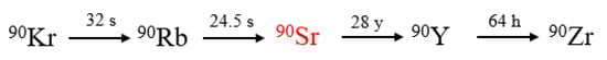 90Sr (T½ = 28.79 y) is one of the most important hazardous radionuclides with respect to radiological safety to human and the environment due to its long half-life and high fission yield [1,2,3]. 90Sr is a fission product of 235U and 239Pu; its decay chain is shown in Figure 1 [4]. 90Sr emits beta particles with a maximum energy of 546 keV and decays to short-lived 90Y (t½ = 64 h). 90Y decays to a stable nuclide 90Zr by emitting beta particles with a maximum energy of 2280 keV [5]. There are three main sources of 90Sr in the environment: (1) Global fallout from the atmospheric nuclear weapons testing during the 1950s–1980s [6,7,8,9], with a total 90Sr inventory of 804 PBq [10,11,12]. (2) Nuclear accidents including the former Soviet Union Chernobyl nuclear power plant (SUCNPP) accident in 1986 and the Fukushima Daiichi nuclear power plant (FDNPP) accident in 2011 in Japan. The Chernobyl NPP accident had released up to 10 PBq of 90Sr into the surrounding environment, especially in the Black Sea [13,14,15,16], while the Fukushima accident was reported to release 1 PBq of 90Sr mostly into the Pacific Ocean [17,18,19,20,21]. (3) Regulated releases from the operation of nuclear facilities such as nuclear power plants and nuclear reprocessing plants [22].