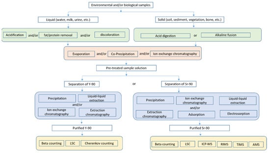 In our literature search, keywords ‘strontium-90′, ‘determination’, ‘analysis’, ‘separation’, ‘environmental’, and ‘biological’ were used. Table 1 summarizes the analytical methods reported for 90Sr determination in environmental and biological samples since the 21st century. Generally, analytical procedures for 90Sr determination are divided into three stages including sample pretreatment, chemical purification and measurement as illustrated in Figure 2 and detailed in this review. It is noteworthy that the quantification of 90Sr can be performed by directly measuring 90Sr using a radiometric or mass spectrometric method or by an indirect measurement through its daughter 90Y using a radiometric method. In both cases, the isolation of 90Sr or 90Y from the sample matrix and interfering elements is necessary due to the relatively low penetrating abilities and continuous energy spectrum of beta particles. Thereby, the development of sample pretreatment and chemical purification protocol is always served for the measurement technique selected for 90Sr quantification.