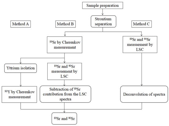 Grahek et al. [98] observed that the 90Sr measured on the proportional counter by counting 90Sr–90Y in the radioactive equilibrium can significantly reduce the detection limit compared to the measurement on the low-level scintillation counter by Cherenkov counting. Rondahl et al. [119] compared three measurement strategies for 89Sr and 90Sr, wherein Method A was based on a two-stage chemical separation and measures 89Sr and 90Sr (via 90Y) sequentially; B was a spectral subtraction method, and C was a spectral convolution method (Figure 3). The results indicate that Method A is suitable for the determination of 90Sr over the entire range of the 89Sr/90Sr ratio. The simultaneous determination of 89Sr and 90Sr in Methods B and C has great uncertainty, especially for 90Sr. In an emergency, the most appropriate method is to measure 89Sr after the first chemical separation and then measure 90Sr and 90Y after the second chemical separation.