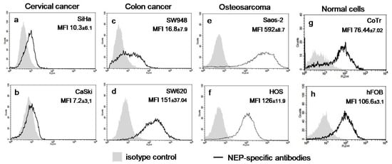 Expression of NEP at the protein level in primary (SiHa) (a) and metastatic (CaSki) (b) cervical cancer cells, primary (SW948) (c) and metastatic (SW620) (d) colon cancer cells, primary moderately (Saos-2) (e) and highly (HOS) (f) aggressive osteosarcoma cells, normal epithelial cells of the intestine (CoTr) (g), and normal osteoblasts (hFOB) (h). The level of NEP was quantified by means of flow cytometry after cell staining with the PE-conjugated mouse IgG1 isotype control and with PE-conjugated mouse anti-human NEP mAb IgG1. The level of NEP was expressed as Mean Fluorescence Intensity (MFI) ± SD of three independent experiments. The histograms shown are representative.