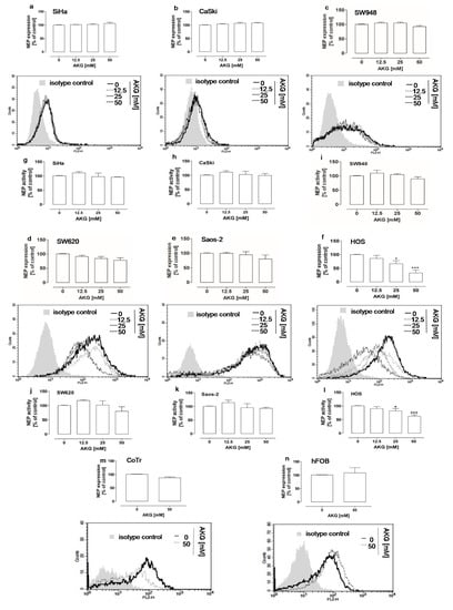 Next, the cancer cells and the normal cells were treated with non-cytotoxic concentrations, i.e., 12.5 mM, 25 mM, and/or 50 mM of AKG, respectively, to examine the influence of AKG on NEP expression. These concentrations were chosen according to Żurek 2019 and Kaławaj 2020 (for hFOB, HOS, and Saos-2 cell lines) and were established in the present study (for SiHa, CaSki, SW948, SW620, and CoTr cell lines; Supplementary Figure S1). The flow cytometry analysis revealed that AKG significantly influenced the NEP protein level only in the HOS cells (Figure 2f). The neprilysin level decreased by approx. 33% and 68% in the osteosarcoma cells after the treatment with 25 mM and 50 mM AKG, respectively, in comparison with the control cells. The results of the study on the NEP activity in the AKG-treated cells were consistent with the findings reported in the aforementioned studies. Namely, a statistically significant approx. 18% and 38% decrease in the NEP activity was observed only in the HOS cells after the treatment with 25 mM and 50 mM AKG, respectively, in comparison with the control cells (Figure 2l). In turn, the NEP protein level and activity were unaffected, i.e., neither down- nor upregulated, by the AKG treatment in the other cancer cells, i.e., SiHa (Figure 2a,g), CaSki (Figure 2b,h), SW948 (Figure 2a,e), SW620 (Figure 2b,f), and Saos-2 (Figure 2c,g). Similarly, the level of NEP was not changed after the AKG treatment in the normal epithelial cells (Figure 2i) and osteoblasts (Figure 2j).