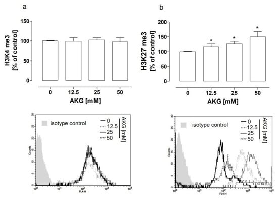 Taking into account the aforementioned results and the role of AKG as a co-substrate of histone demethylases, to elucidate the mechanism of the AKG-induced NEP downregulation in the HOS cells, further studies were aimed at the examination ofthe methylation status of histone H3 at two different positions, i.e., lysine 4 and 27, whichresulted in opposite effects, i.e., activation and inactivation of gene transcription, respectively. The results indicated that the treatment of the HOS cells with AKG did not change the methylation level at the H3K4 position (Figure 3a), in contrast to the H3K27 position (Figure 3b). Surprisingly, a significant increase in the level of trimethylation of lysine 27 was detected (Figure 3b).
