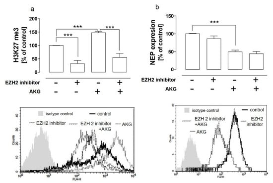 The enhancer of zeste homolog 2 (EZH2) methyltransferase was partially implicated in the AKG-induced hypermethylation of lysine 27 but not in the downregulation of NEP in the osteosarcoma cells. The HOS cells were treated with AKG (50 mM) and/or the EZH2 inhibitor EPZ005687 (10 µM) for 72 h. The me3 modification of histone H3 at lysine 27 (a) and NEP expression (b) were detected as described in Figure 2 and Figure 3, respectively. The histograms are representative and correspond with the results presented in the graphs. The results were expressed as a percent of the control (0 mM) ± SD of three independent experiments. Statistically significant differences: *** p < 0.001, in comparison with the control cells or with the AKG-treated cells (one-way ANOVA followed by Tukey’s post-hoc test).