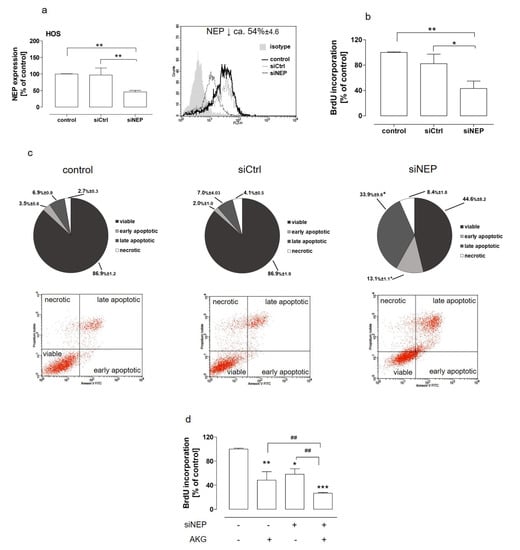 NEP was implicated in growth and in the AKG-mediated antiproliferative effects towards osteosarcoma cells. The level of NEP knockdown in the HOS cells was determined by flow cytometry (a). The proliferation and apoptosis of the NEP-expressing (control and siCtrl) and NEP-silenced (siNEP) HOS cells were examined by means of BrdU (b,d) and flow cytometry assays after AnnexinV-FITC/propidium iodide staining (c), respectively. The cells were treated with 50 mM AKG. Isotype—control, NEP-positive cells stained with PE-conjugated mouse IgG1 isotype control, control—siRNA-untreated NEP-positive cells, siCtrl—negative siRNA-treated cells, siNEP—NEP-silenced cells. The results were expressed as a percent of the BrdU incorporation level in the control cells or as a percent of viable, early apoptotic, late apoptotic, or necrotic cells among all the analyzed cells. The dot plots are representative and correspond with the results presented in the graphs. Statistically significant differences: * p < 0.05, ** p < 0.01, *** p < 0.001 in comparison with the control cells or ## p < 0.01 in comparison with the siNEP- or AKG-treated cells (one-way ANOVA followed by Tukey’s post-hoc test).