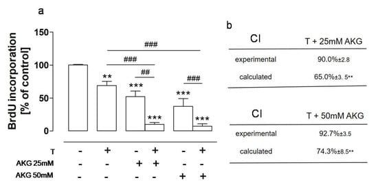 Enhanced antiproliferative activity of combined treatment of osteosarcoma cells with AKG and thiorphan. The HOS cells were treated with thiorphan (T, 500 µM) and AKG (25 mM or 50 mM) for 72 h. The proliferation of the cells was examined by means of the BrdU assay (a), and the combination index (CI) was calculated with the method described by Peters et al. [37] (b). The results were expressed as a percent of the BrdU incorporation level in the control cells. Statistically significant differences: ** p < 0.01, *** p < 0.001, in comparison with the control cells or in comparison with the experimental combination index; ## p < 0.01, ### p < 0.001 in comparison with T- or AKG-treated cells, respectively (one-way ANOVA followed by Tukey’s post-hoc test).