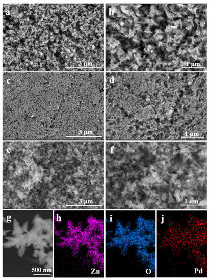 Typical SEM images of ZnO (a,b), Pd (c,d), and Pd-ZnO (e,f) nanostructures. (g) HAADF-STEM image of the Pd-ZnO nanocomposites, and (h–j) energy-dispersive X-ray (EDX) maps of Zn (h), O (i), and Pd (j), respectively.