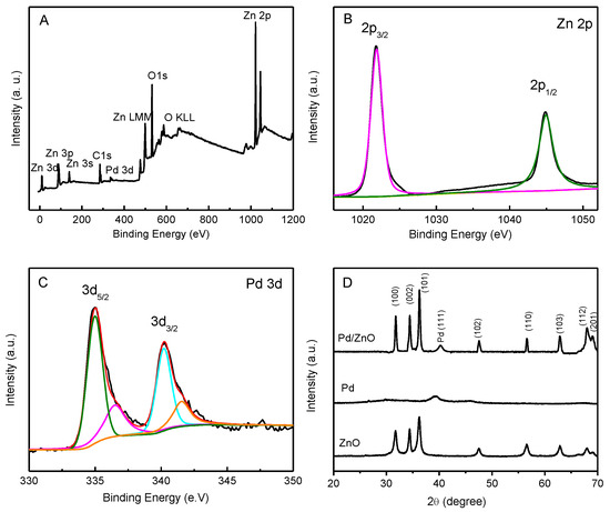 The survey XPS spectrum (panel A), the XPS spectra of Zn 2p (panel B), and Pd 3d (panel C) of Pd-ZnO nanostructures. Panel D shows the typical XRD patterns of ZnO, Pd, and Pd-ZnO nanostructures.