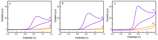 Cyclic voltammograms of ZnO/GCE (A), Pd/GCE (B), and Pd-ZnO/GCE (C) in the absence (curve a) and presence (curve b) of 0.5 mM nitrite in PBS (pH 7.0). The scan rate is 50 mV/s.