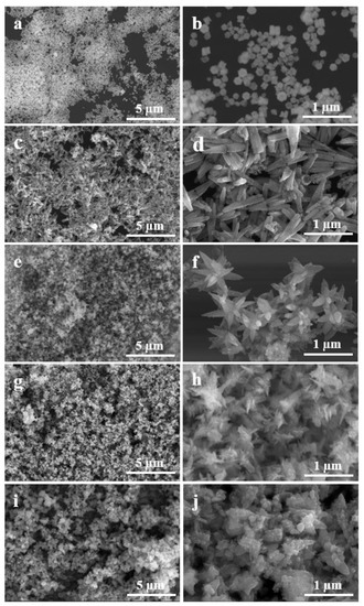 SEM images of the Pd-ZnO nanostructures fabricated at pH ≈ 6 (a,b), pH ≈ 7 (c,d), pH ≈ 8 (e,f), pH ≈ 9 (g,h), and pH ≈ 10 (i,j), respectively.