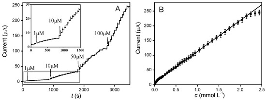 To assess the electrochemical determination of nitrite in Pd-ZnO-modified electrodes, the amperometric technique was applied. Figure 5A presents the typical amperometric response of Pd-ZnO/GCE towards successive injections of nitrite into 0.1 M PBS at 0.78 V. As can be seen, after the addition of nitrite, a rapid increase in the oxidation current was observed and reached the steady-state value within 3 s, suggesting the modified electrode displays a rapid response toward nitrite oxidation, which is desirable for the real-time analysis of real samples. Moreover, Figure 5B shows the corresponding calibration plot generated from Figure 5A. It clearly exhibited a good linear relationship between the oxidation current and the nitrite concentrations from 1 µM to 2350 µM with a correlation coefficient of 0.9994, sensitivity of approximately 151.9 µA mM−1 cm−2, and the detection limit of ca. 0.2 µM with a signal/noise ratio (S/N) of 3. These analytical performances of the Pd-ZnO-modified electrode are superior or comparable to those previously reported in other studies (Table 1).