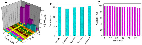 The selectivity capability plays a key role in estimating the performance of a developed sensor, because various types of interference may co-exist in practical samples. In order to investigate the selectivity of the developed sensor, the amperometric responses of some possible interferents, including some inorganic ions (e.g., Na+, K+, Ca2+, NO3−, and CO32−) and some electroactive materials (e.g., glucose, uric acid (UA), and ascorbic acid (AA)) along with 0.5 mM nitrite were recorded at different applied potentials and are exhibited in Figure 6A. The concentrations of interferent species were 10-fold that of nitrite. It can be seen that these inorganic ions had no obvious impact on the detection of nitrite. However, for some electroactive materials, especially glucose, there were obvious signals at lower potentials (25% at 0.6 V and 18% at 0.7 V). However, the interference at the applied potential (0.78V) was below 5%, indicating that the fabricated nitrite sensor had the biggest current response at 0.78 V, and the sensor was highly selective toward the detection of nitrite in the presence of these co-existent species.