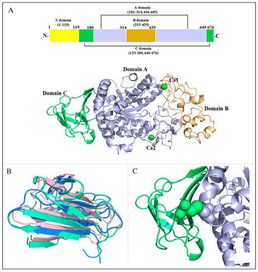 Overall structure of MalS. (A) Schematic overview of MalS with Ca2+-binding sites. The domains A, B, and C are shown in light blue, light orange, and cyan, respectively. The Ca2+ ions are shown in green. The disulfide bond between domains A and C is depicted as a sphere; (B) Structural alignment of domain C. The MalS protein neopullulanase 1 (1uh3) and cyclomaltodextrinase (1ea9) are shown in light pink and marine; (C) Disulfide-bridged site. The disulfide bond between domains A and C is depicted as a sphere.